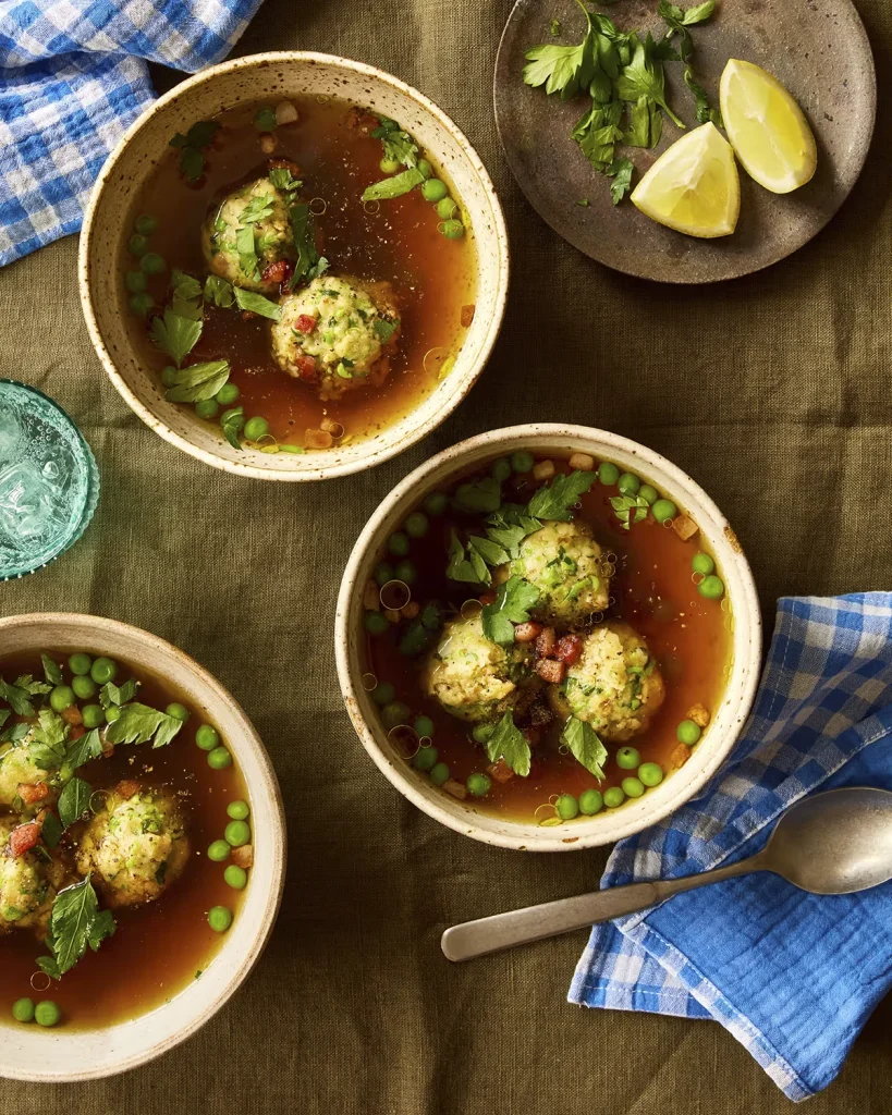 Spring into action: Ravinder Bhogal’s peas, broth and bread dumplings. Photograph: The Guardian. Food and prop styling: Lucy Turnbull. Food styling assistant: Valeria Russo.